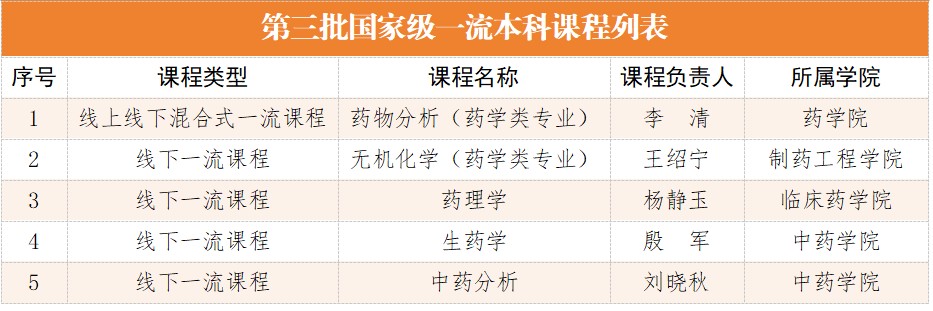 近日,第三批国家级一流本科课程认定结果揭晓,我校药物分析、无机化学、药理学、生药学、中药分析5门课程入选,其中,线上线下混合式一流课程1门,线下一流课程4门。截至目前,学校共获批国家级一流本科课程16门,省级一流本科课程131门。
